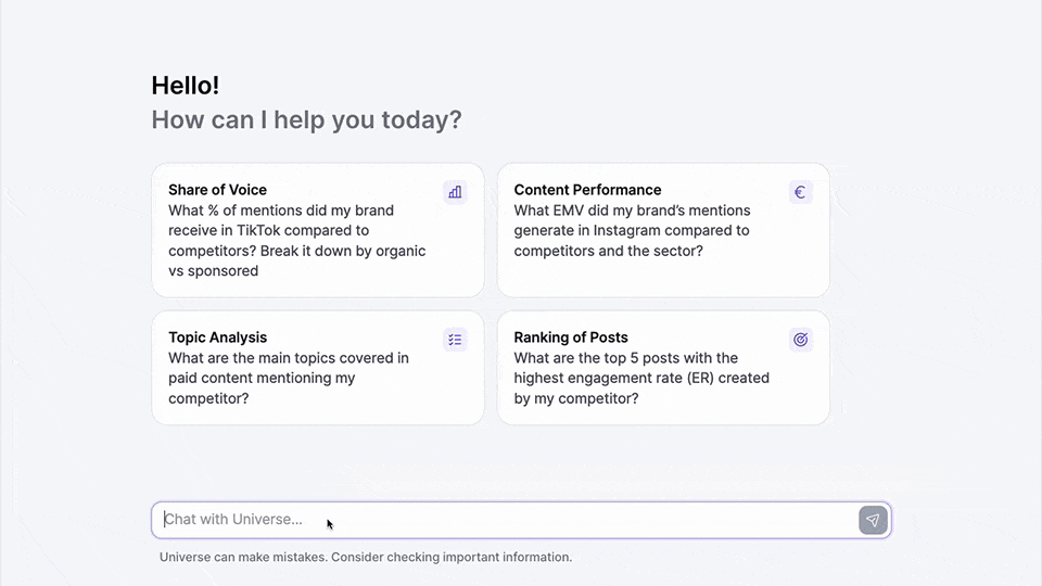 Universe is an AI-powered Agent built specifically for Influencer Marketing. With access to over +3 billion pieces of content from Instagram and TikTok, Universe automatically and conversationally analyzes this massive amount of data quicker than you can make a cup of coffee.